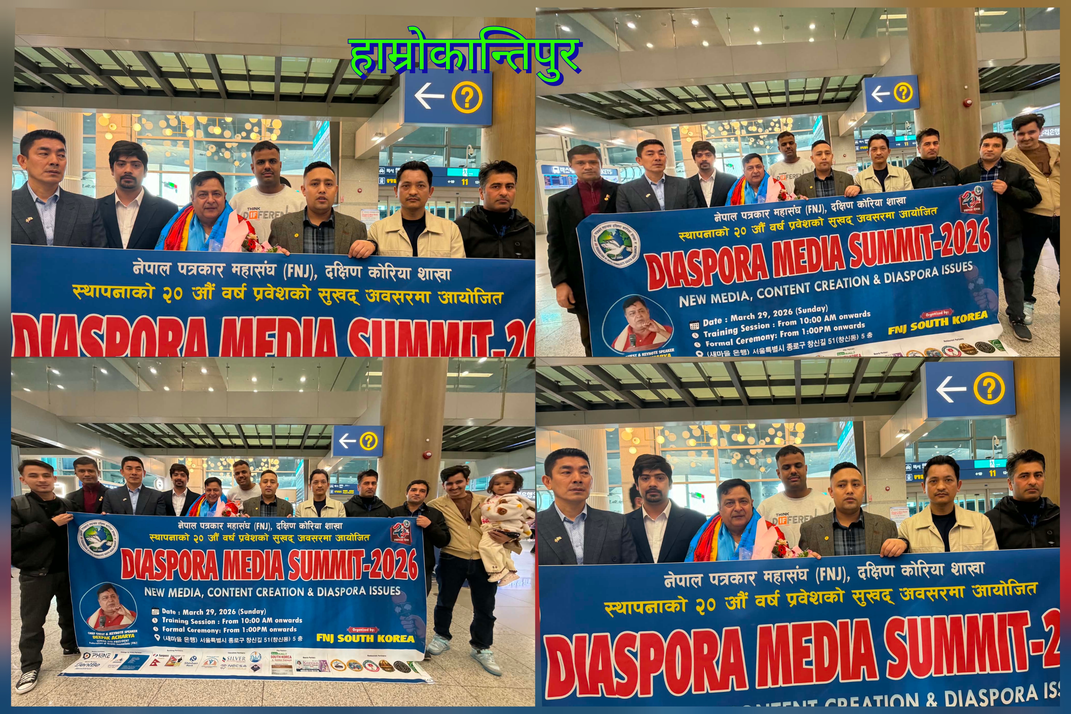 DIASPORA MEDIA SUMMIT-2026 कार्यक्रमको लागि व.उपाध्यक्ष आचार्य काेरिया प्रस्थान हुनुभएको छ। नेपाल पत्रकार महासंघ केन्द्रीका वरिष्ठ उपाध्यक्ष दीपक आचार्य FNJ कोरिया शाखाको २०औँ वर्ष प्रवेशको..