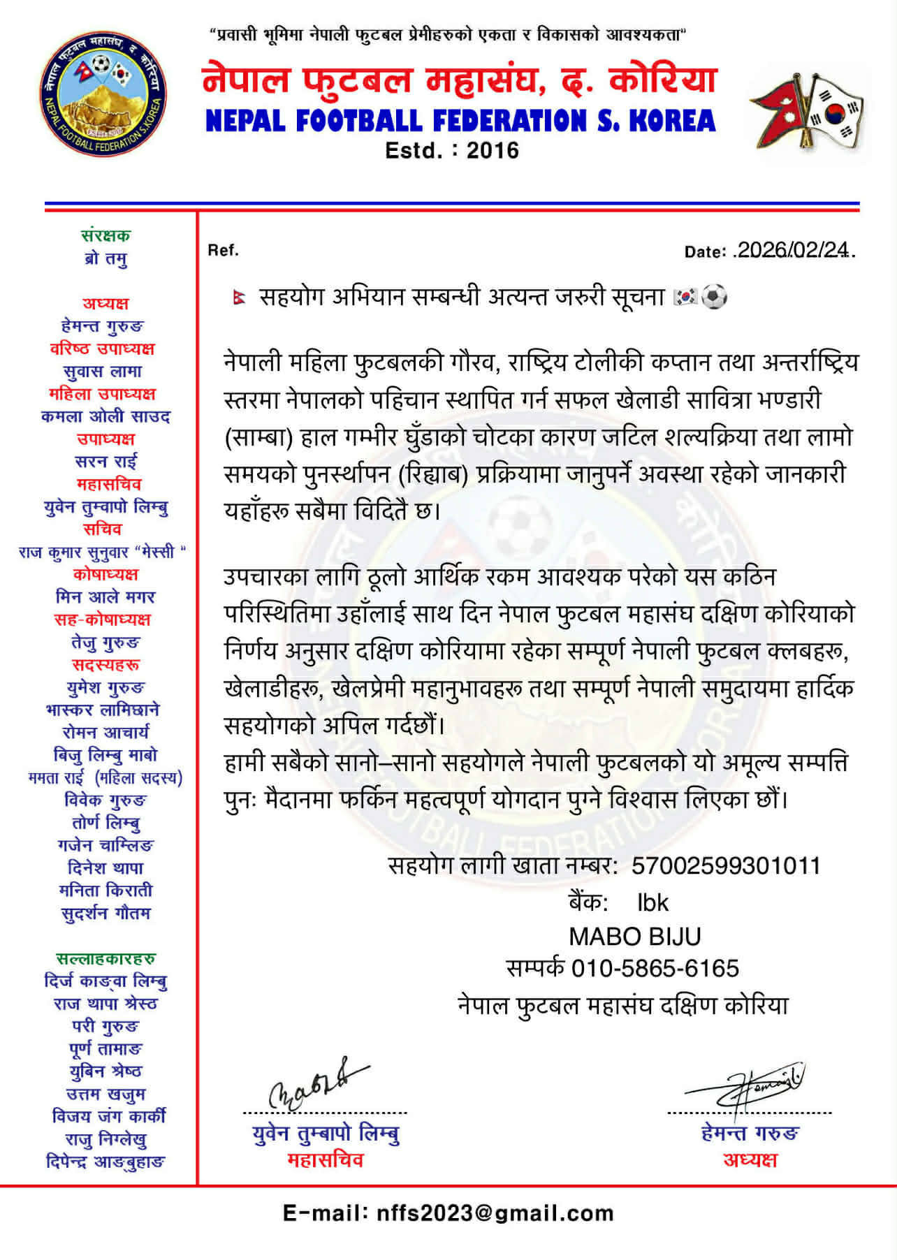 सोहि अपिल लाई मध्य नजर गर्दै नेपाल फुटबल महासंघ दक्षिण कोरियाले हिजो एक सूजना जारी गर्दै आर्थिक सहयोग अभियान शुरु गरेको छ। उक्त जानकारी भने संघका संरक्षक ब्रो तमुले गराएका हुन् ।