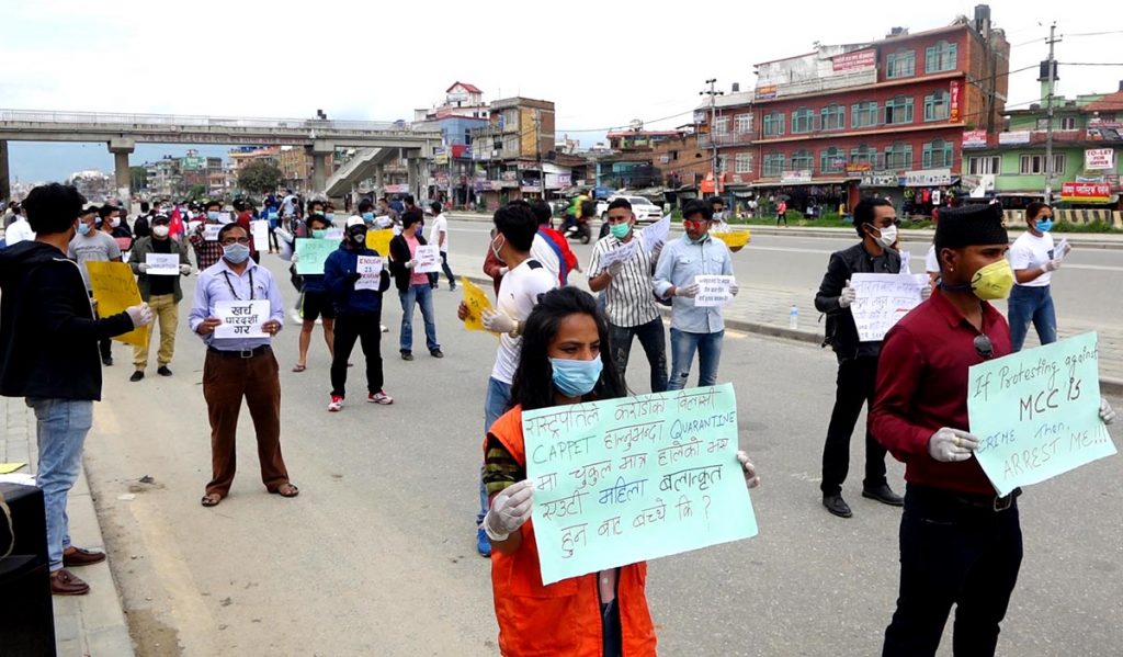 यदि एमसीसीको विरुद्धमा प्रदर्शन गर्नु अपराध हो भने मलाई पक्राउ गर, भारतबाट ल्याएको अदुवा लसुन नक्कली परेजस्तो छ, कोरोना त झन बढ्यो त डाक्टरसाहब, भ्रष्टाचार गर्न बन्द गरे, क्वारेन्टिनमा चुक्कुल हालेको भए एउटी महिला बलात्कृत हुनबाट बच्थे की ? र पिसिआर परीक्षणको दायरा बढाउजस्ता नारासहितका प्लेकार्ड बोकेर उनीहरु सरकारको विरोधमा प्रदर्शनमा उत्रिएका हुन् । एमसीसीकाे विराेधमा दिनहुँजसो प्रदर्शन भए पनि सरकारले ठाेस निर्णय भने निकाल्न अझै सकेकाे छैन ।