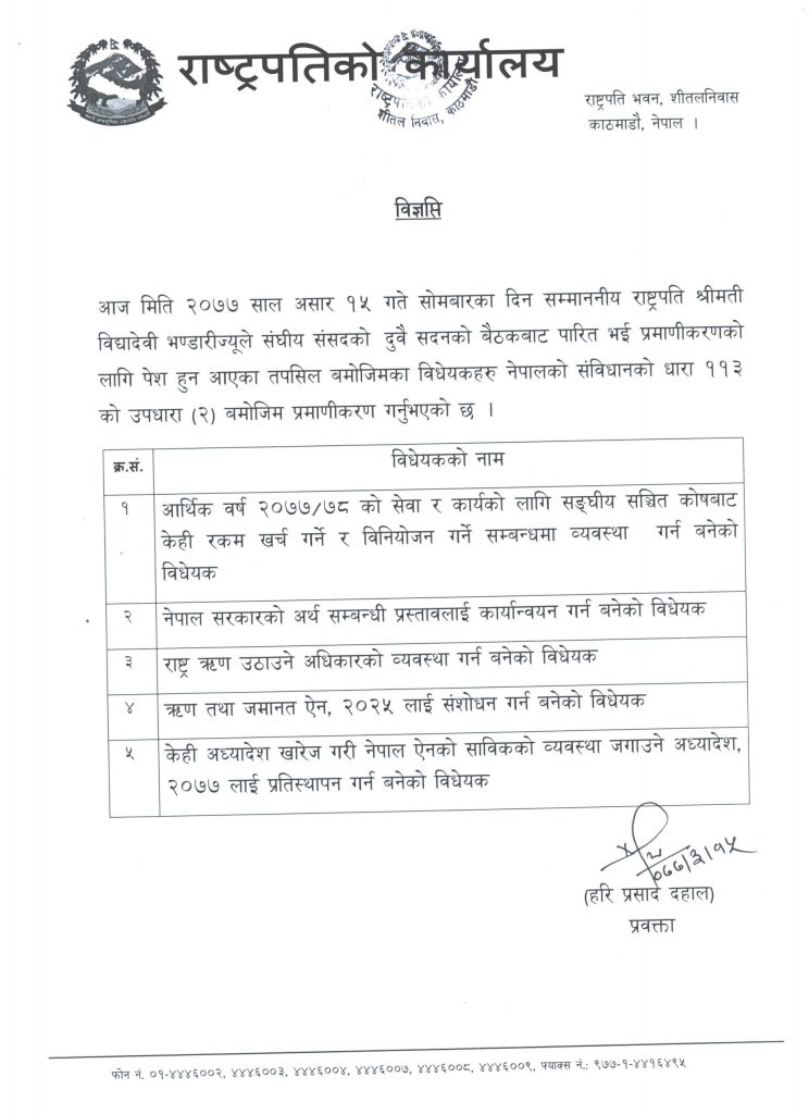त्यस्तै राष्ट्र ऋण उठाउने अधिकारको व्यवस्था गर्न बनेको विधेयक, ऋण तथा जमानत ऐन, २०२५ लाई संशोधन गर्न बनेको विधेयक र केही अध्यादेश खारेज गरी नेपाल ऐनको साविकको व्यवस्था जगाउने अध्यादेश, २०७७ लाई प्रतिस्थापन गर्न बनेको विधेयक उहाँले प्रमाणीकरण गरेकी हुन् । राष्ट्रपति कार्यालयले आज जारी गरेको प्रेस विज्ञप्तिमा राष्ट्रपति भण्डारीले सङ्घीय संसद्को दुवै सदनको बैठकबाट पारित भई प्रमाणीकरणका लागि पेश भएका ती विधेयक नेपालको संविधानको धारा १३३ को उपधारा ९२० बमोजिम प्रमाणीकरण गरेको भनी उल्लेख गरिएको छ ।