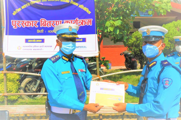 उक्त विजेताहरूलाई महाशाखाका प्रमुख प्रहरी वरिष्ठ उपरीक्षक भिम प्रसाद ढकाल, इम्पेरियल बिजनेश कलेजका प्रमुख कार्यकारी अधिकृत जिवन लामा गोले, घुन्सा फाउण्डेसनका अध्यक्ष याङ्जोङ् शेर्पा र प्रहरी उपरीक्षक वामदेव गौत्तमले पुरस्कार प्रदान गरेका थिए । यो प्रतियोगितामा काठमाडौ उपत्यकामा कार्यरत ५१ जना ट्राफिक प्रहरीहरू सहभागी भएका थिए । निबन्ध प्रतियोगिताका छनोट तथा मूल्याङ्कन सेन्ट जेभियर्सका लेक्चर खेम प्रसाईले गरेका थिए विश्वभर फैलिरहेको कोरोना भाईरसको रोकथाम र नियन्त्रण गर्नका लागि लक डाउन भए संगै ट्राफिक प्रहरीले आफ्नो ड्यूटीको क्रममा कोरोनाबाट उत्पन्न समस्या, संक्रमणबाट बच्ने उपायहरु, ट्राफिक प्रहरीको कर्तव्य र नागरीक मैत्री व्यवहार लगायतका विषय समेटी ट्राफिक प्रहरी महाशाखा तथा मातहत कार्यालयका ट्राफिक प्रहरीहरूबीच २०७६ चैत्र २४ गतेदेखि चैत्र २९ गतेसम्म निबन्ध लेखनको लागि समय दिएको महाशाखाका प्रमुख प्रहरी वरिष्ठ उपरीक्षक भिम प्रसाद ढकालले जानकारी दिए ।