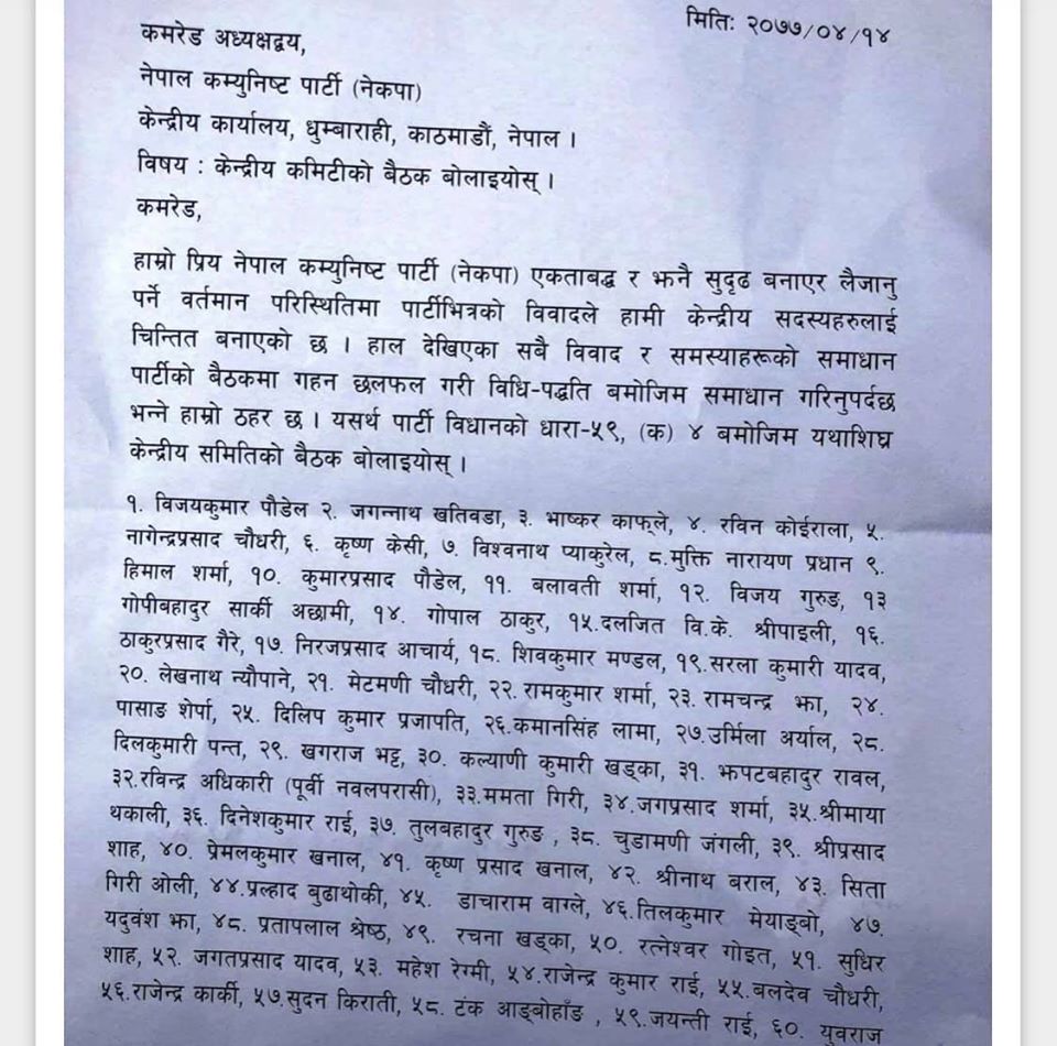 पार्टीमा पछिल्लो समय विवाद बढ्दै गएको तर सचिवालय र स्थायी समितिले त्यसको समाधान निकाल्न नसकेकाले आफूहरुले केन्द्रीय कमिटी बैठकको माग गरेको उनको भनाई छ । नेकपाको विधानअनुसार २५ प्रतिशत अर्थात् १११ जना सदस्यले हस्ताक्षर गरि केन्द्रीय समिति बैठक माग गरे महिना दिनभित्र बैठक बोलाउनु पर्छ।