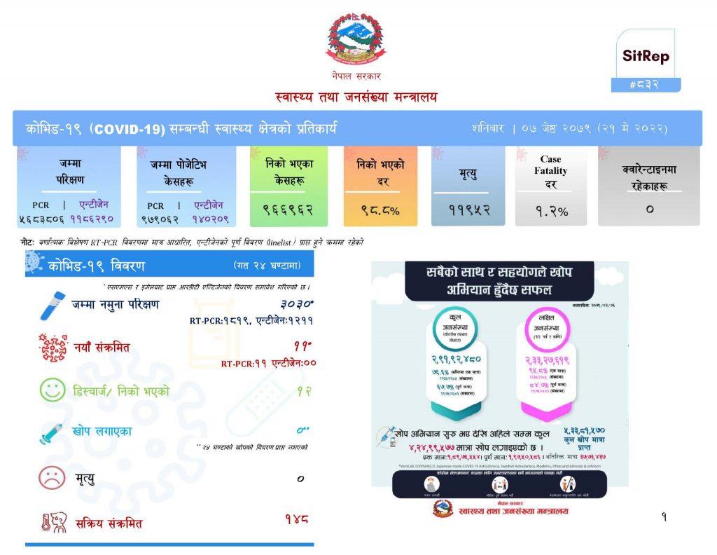 काठमाडौं,चैत जेठ ७ गते। गएको २४ घण्टामा ११ जना संक्रमित थपिएका छन् । ३ हजार ३० जनामा कोरोना परिक्षण गरियकोमा पीसीआर विधिबाट ११ जना र एन्टीजेन परिक्षण विधिबाट ० जना गरि ११ जना संक्रमित थपिएका हुन् ।