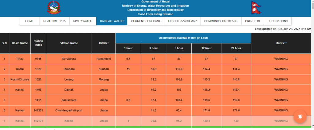 मंगलबार विहान ९ बजेसम्म बाढीले विभिन्न नदीमा सतर्कता तह पार गरेको तथ्याङक यस्तो छ:
