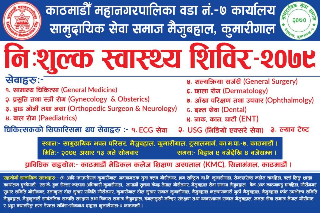 वडा नंं. ७ र सामुदायिक सेवा समाज मैजुबहालको संयुक्त आयोजनामा र काठमाडौं मेडिकल कलेज शिक्षण अस्पताल, सिनामंगलको प्राविधिक सहयोगमा सहीद स्मृति सामुदायिक भवन, मैजुबहाल परिसरमा स्थानीय विभिन्न संघसंस्थाहरूको सहभागितामा सोमबार निःशुल्क स्वास्थ्य शिविर सम्पन्न गरिएको हो ।