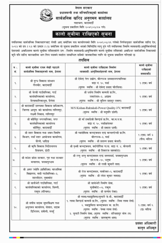 सोमबार सार्वजनिक खरिद अनुगमन कार्यालयले सूचना प्रकाशन गर्दै कालोसूचीमा पर्ने १० वटा कम्पनी र ठेकेदारको नाम सार्वजनिक गरेको हो ।