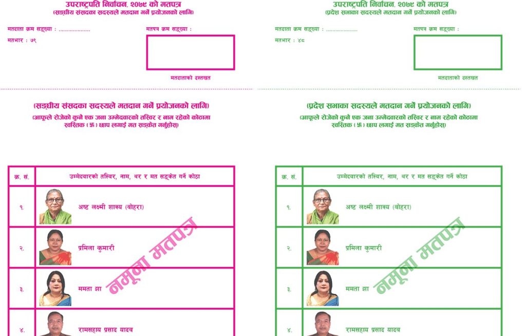 काठमाडौं- निर्वाचन आयोगले उपराष्ट्रपति निर्वाचन, २०७९ को मतपत्रको नमूना सार्वजनिक गरेको छ । उक्त निर्वाचनका लागि दुई प्रकारको मतपत्रको व्यवस्था गरिएको छ ।सङ्घीय संसद्का सदस्यले मतदान गर्ने प्रयोजनका लागि रातो मसी र प्रदेशसभा सदस्यले मतदान गर्ने प्रयोजनका लागि हरियो मसीले मतपत्र छपाइ गरिएको छ । मतपत्रमा उम्मेदवारको तस्बिर र नाम समावेश गरिएको छ ।