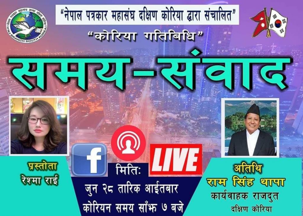 दक्षिण काेरिया – काेरियामा रहेका नेपालीको वर्तमान अबस्था र समाधानका लागि पहलकदमी उठाउन माग गर्दै नेपाल पत्रकार महासंघ दक्षिण काेरियाले आफ्नाे कार्यक्रम समय संवादमा काेरियाका कार्यबाहक राजदुत राम सिंह थापालाई निम्त्याउने भएको छ । आइतबार साझ ७ बजे , जुन २८ तारिक उक्त कार्यक्रममा प्रस्ताेता रेश्मा राई रहेकि छिन् भने अतिथि राजदुत राम सिंह थापा रहेका छन् । उक्त कार्यक्रममा पत्रकार महासंघ दक्षिण काेरियाकाे फेसबुक पेजबाट लाइभ हुनेछ ।