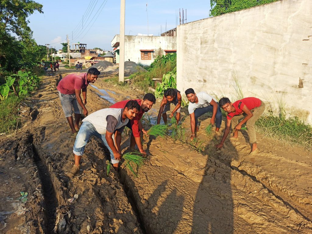 परवानीपुर गाउँपालिका वडा नं. ५ नौतन बहुअरी टोलकाे सड़क खण्डमा पर्ने बाटोमै धान रोपी सांकेतिक सुझाव सम्बन्धित निकायलाई ध्यानाकर्षण गरेकाे युवाहरु बताउछन् । सडक समस्याहरुको पहिचान तथा तत्काल समस्या समाधानको लागि उक्त सांकेतिक सुझाव दिएकाे विद्यार्थी नेता अनेरास्ववियु को बिबेक कुमार साहले बताए ।