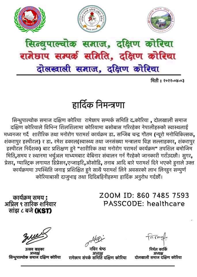 सिन्धुपाल्चोक समाज दक्षिण कोरिया ,रामेछाप सम्पर्क समिति द.कोरिया र दोलखाली समाज दक्षिण कोरियाले विभिन्न शिलशिलामा कोरियामा बसोबास गरिरहेका नेपालीहरुको स्वास्थलाई मध्यनजर गर्दै शारीरिक तथा मनोरोग परामर्श कार्यक्रम गर्ने भएको छ ।