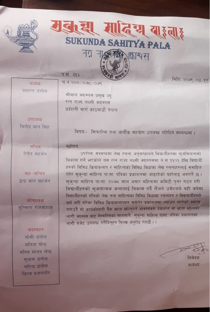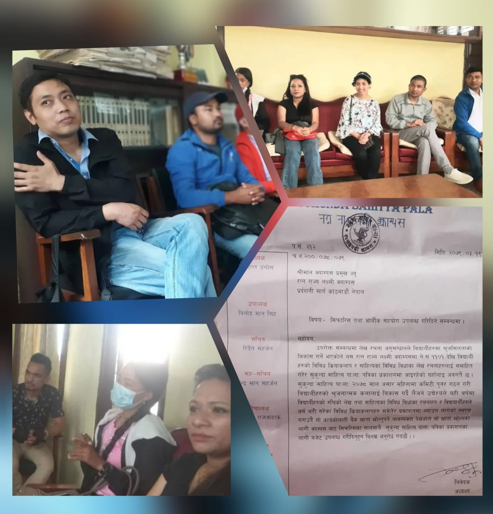 काठमाडौं । २१ बर्षदेखि स्थगित रहेको सुकुन्दा साहित्य पालाको पुर्न प्रकाशनका लागि मातृभाषा बचाउँ एवम् नेपाल भाषा अभियान्ता स्नातक र स्नातकोत्तर तहका मातृभाषानुरागी बिद्यार्थीहरुको उपस्थितिमा सुकुन्दा साहित्य पाःलाःका अध्यक्ष प्रशान्त डंगोल, सचिव रीदेन महर्जनको टोलीले सहयोगको अपीलसहित ज्ञापन पत्र बुझाएका छन् ।