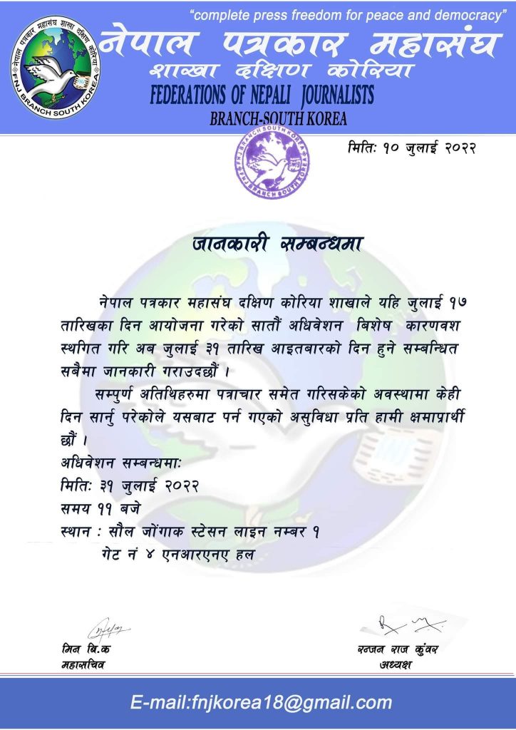 नेपाल पत्रकार महासंघ कोरिया शाखाकाे अधिवेशन जुलाई ३१ तारिखमा सरेकाे छ।