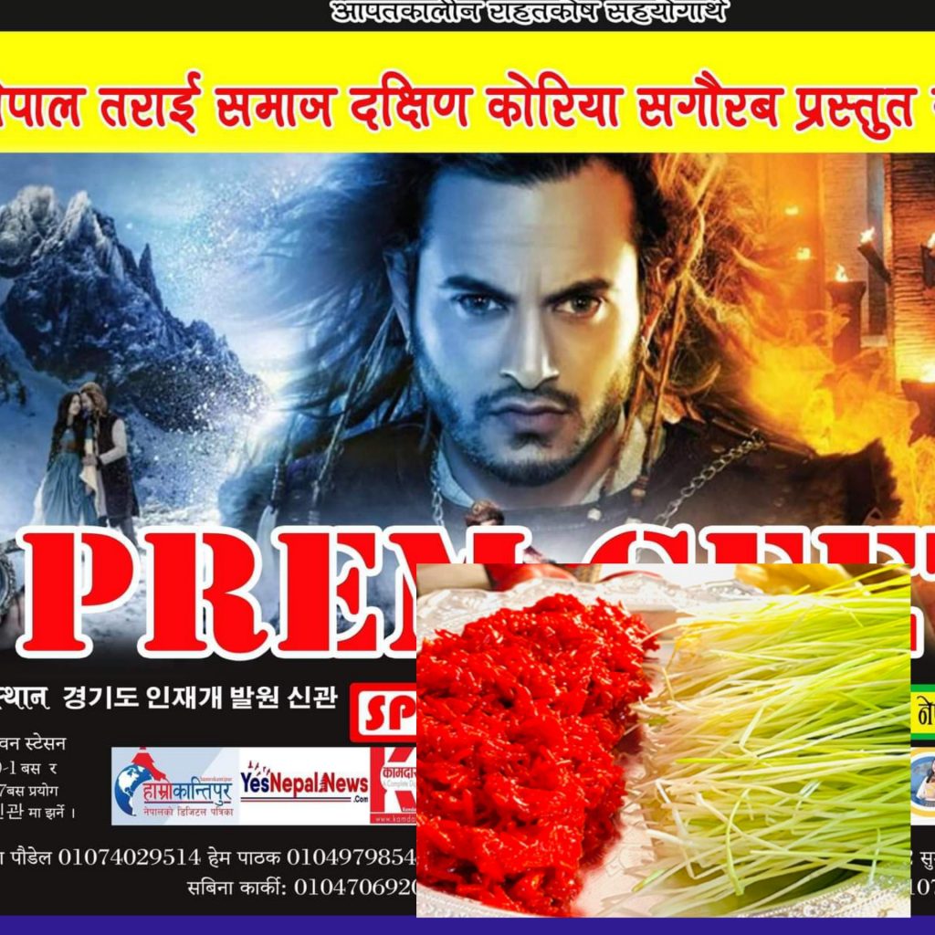 नेपाल तराई समाज दक्षिणकोरिले अक्टोबर ९ तारिखमा नेपाली चलचित्र “प्रेम गीत ३” सञ्चालन गर्ने भएको छ । साथै उक्त दिन नेपालीहरुकाे महान पर्व विजयी दशमीकाे अवसर पारेर टीका ग्रहण कार्यक्रम पनि राखिने भएको छ।
