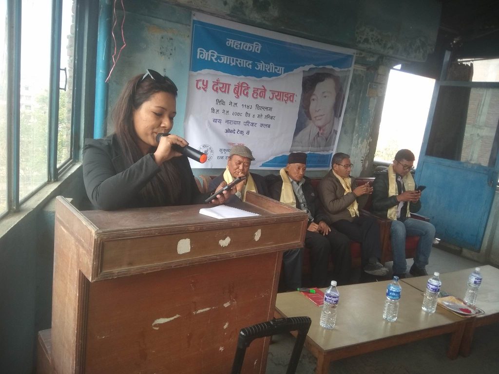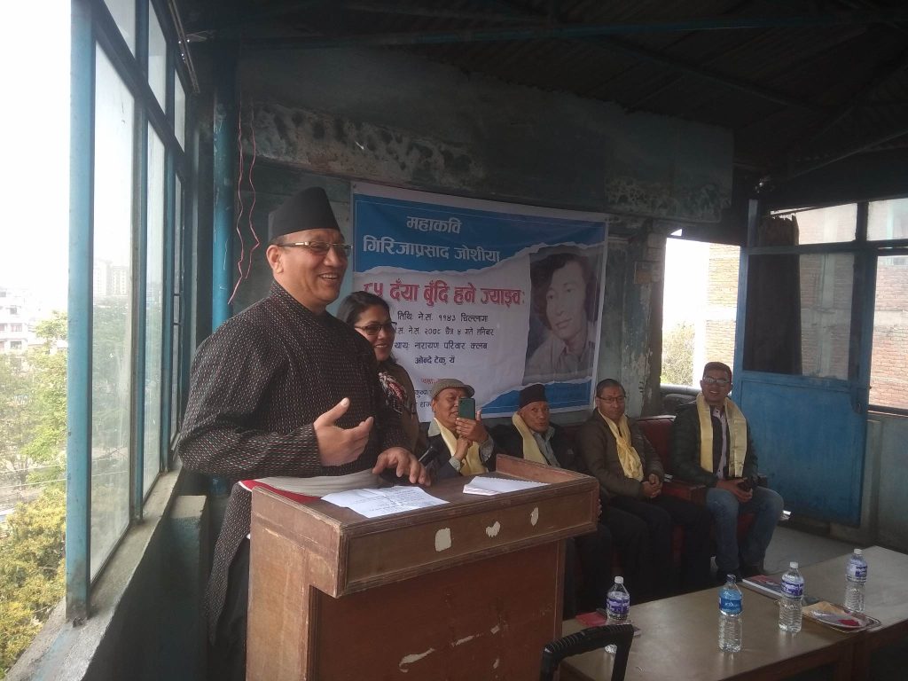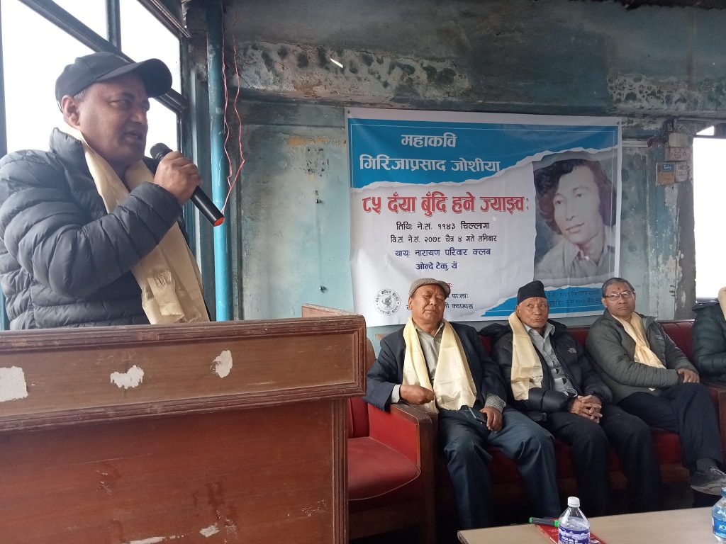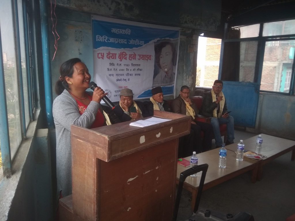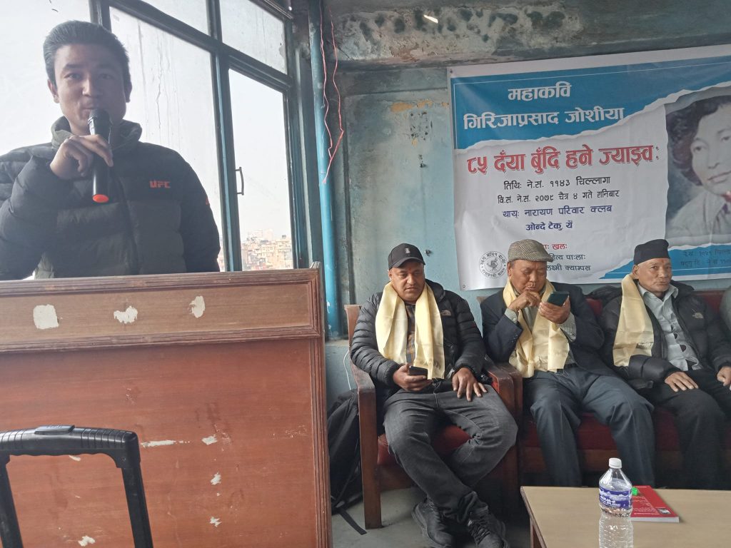 नेपालभाषाका महाकवि गिरिजा प्रसाद जाेशीकाे जन्म जयन्ती मनायाे काठमाडाैं । रत्न राज्यलक्ष्मीक्याम्पसको सुकुन्दा साहित्य पाःलाःको आयोजनामा महाकवि गिरिजाप्रसाद जाेशीको ८५ औं जन्म जयन्ती नारायण परिवार क्लब ओन्दे टेकूमा शनिबार भव्य रूपमा मनाएकाे छ ।