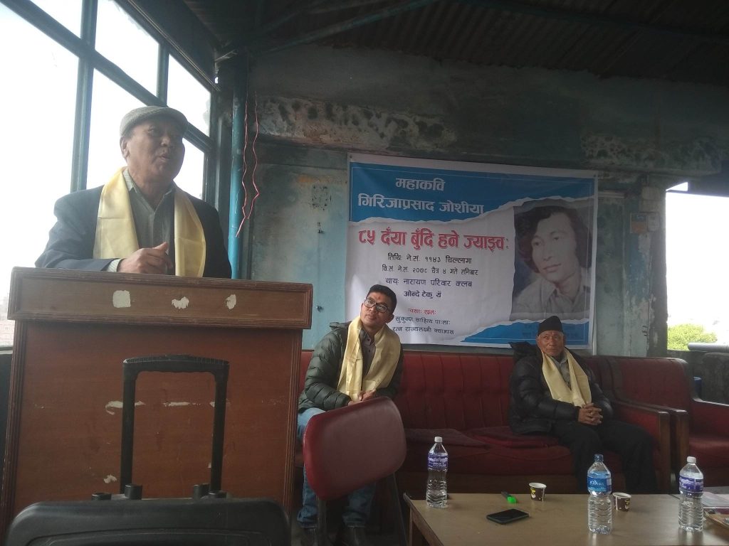 अतिथि अनुपसिंह सुवालले महाकवि गिरिजाप्रसाद जाेशीकाे करिब ६९ वटा कृति मात्रै नभई सो भन्दा बढि एक बोरा जति म्यानूस्क्रीप्ट कृति रहेकाे तथा सो मध्ये १५ वटा कृति प्रकाशित हुन बाँकी रहेको जनाउँदै तात्कालिन पन्चायतकाल राजाको दमनबाट सास्ती भोग्न बाध्य भएका महाकवि गिरिजाप्रसाद जोशीकाे विश्वविध्यालय जनबादी गायक चन्द्रबहादुर चन्द्रबहादु (माइला दाई) रहेकाले महाकविलाई जिवित तुल्याउने हाे भने उहाँको गीतलाई अरक्राइब गर्नेपर्नेमा जोड दिए ।