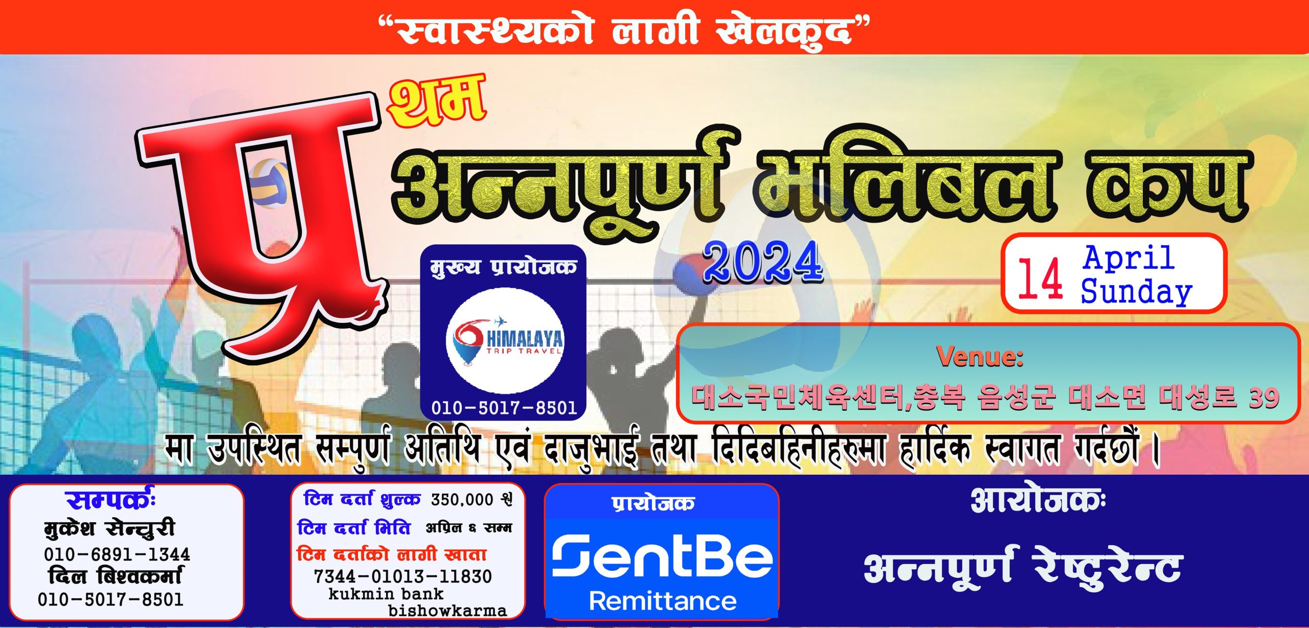 कोरियामा रहेका भलिवल खेलाडिहरु सबैलाई समेटेर खेल जीवनलाई स्वस्थ बनाउन तथा खेलप्रेमीहरुको मनोभावना बृद्दी गर्नको निमित्त अन्नपुर्ण रेष्टुरेण्टले आयोजना गरेको यस खेलमा कोरियामा रहेका सम्पूर्णभलिवल टिमलाई टिम दर्ताको लागी हार्दिक आब्हान गरेको छ।