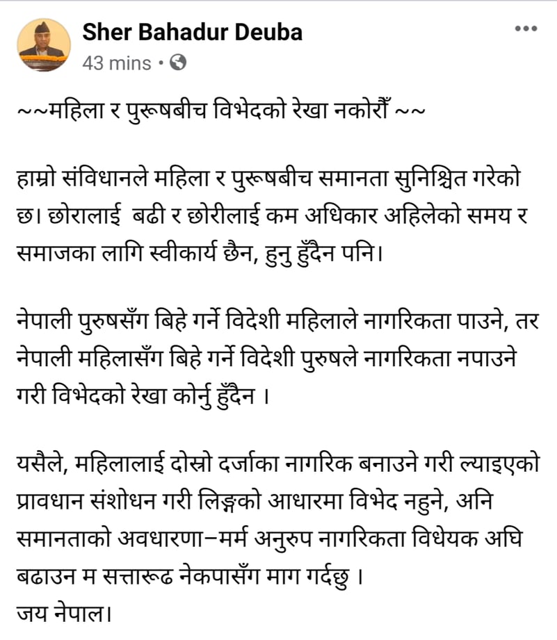 सभापति देउवाले हालै संसदको राज्य व्यवस्था तथा सुशासन समितिबाट बहुमतका आधारमा पारित भएको नागरिकता सम्वन्धी ७ वर्षे प्रावधानको पनि विरोध गरेका छन्। महिलालाई दोस्रो दर्जाको नागरिक बनाउने गरी ल्याइएको प्रावधान संशोधन गरी लिङ्गको आधारमा विभेद नहुने अनि समानताको अवधारणा–मर्मअनुरुप नागरिकता विधेयक अघि बढाउन म नेकपासँग माग गर्दछु’ भन्दै बुधबार देउवाले फेसबुकमा स्टाटस राखेका छन् ।